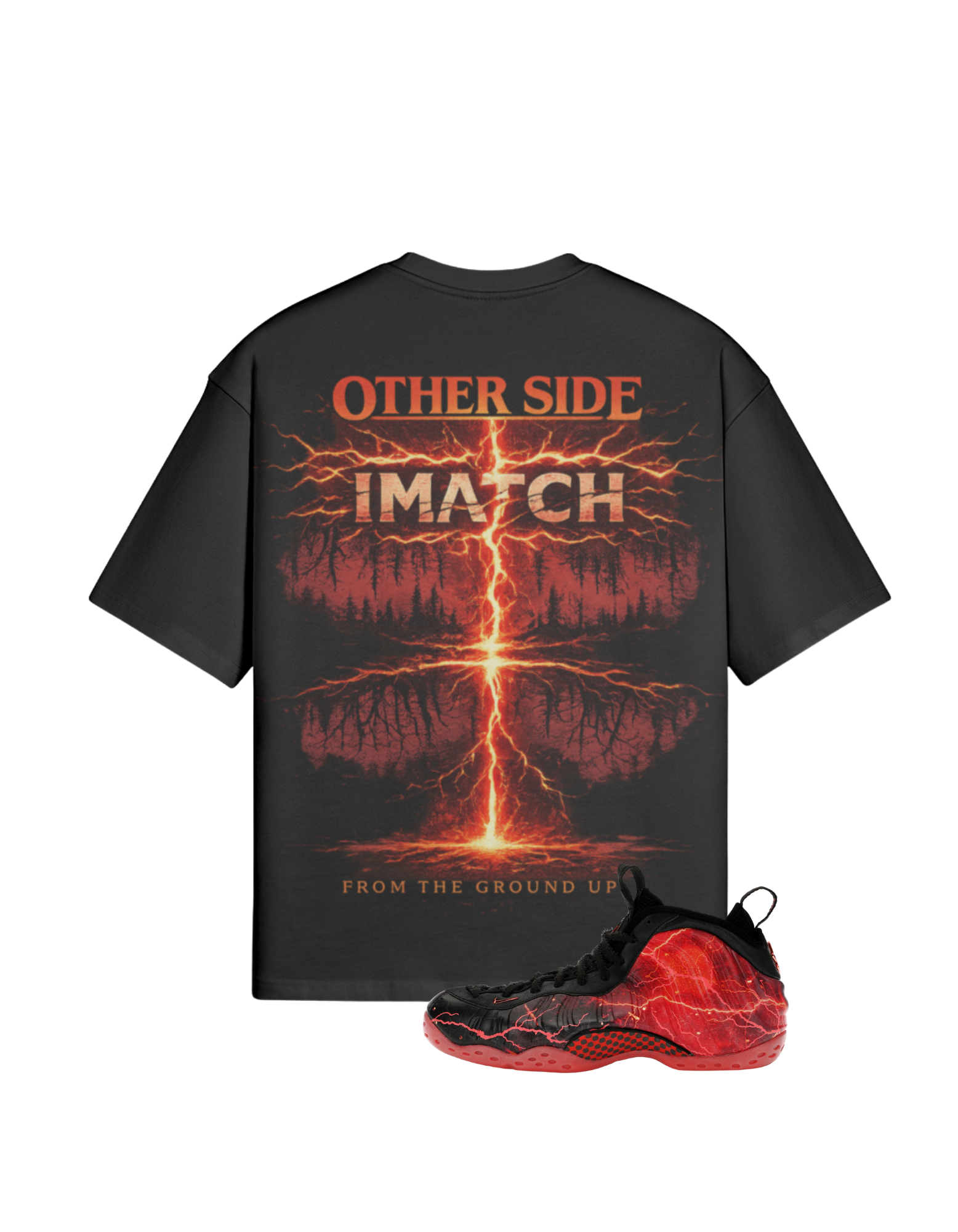 The Other Side Tee is built to mirror the raw energy of the Stranger Things Foamposite. A violent lightning strike tears through the center of the design, splitting reality and revealing a dark mirrored world beneath. The upside-down forest silhouette and crackling red lightning create a supernatural atmosphere that feels pulled straight from another dimension.